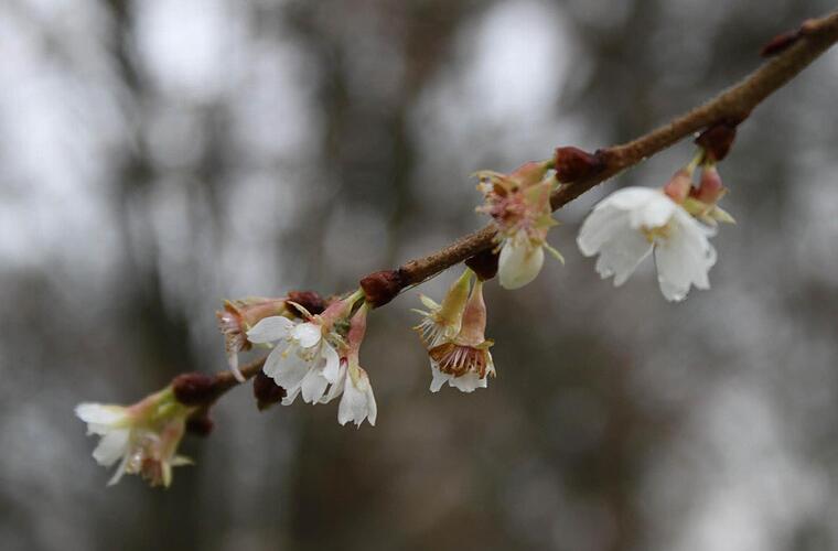Viel zu früh haben die Knospen der Japanischen Zierkirsche ausgetrieben.