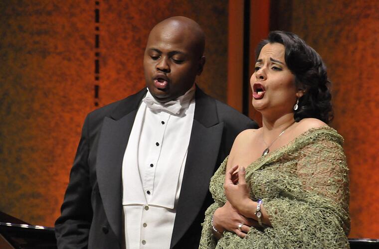 Camila Ribero-Souza (Sopran), Siyabonga Maqungo (Tenor) und Robert Jacob am Klavier präsentierten Werke jüdischer Komponisten und Librettisten im Rahmen der Jüdischen Kulturtage im Rossini-Saal. Die Geschichte der Operette ist ohne jüdische Musiker nicht vorstellbar. Mitte des 19. Jahrhunderts hat sich die Operette in Wien und Paris etwa zeitgleich entwickelt - und das in eine französische, österreichische und ungarische Richtung. Der wohl bekannteste Name ist dabei Jacques Offenbach, Sohn eines jüdischen Kantors.
