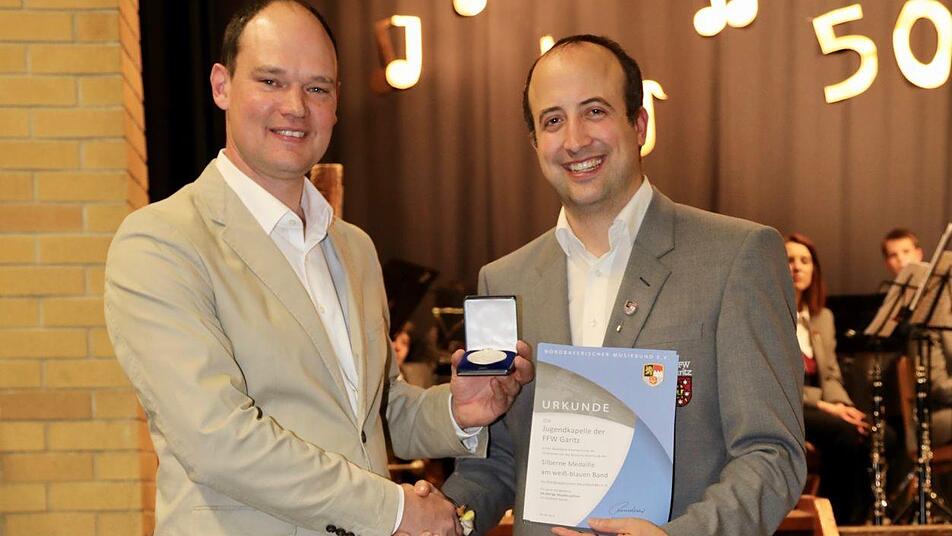 Silberne Medaille am weiß-blauen Band: Außerdem empfing Fabian Schopf stellvertretend für die Jugendkapelle noch drei Ehrungen. Die Silberne Medaille am weiß-blauen Band wurde für 50 Jährige Musiktradition in Garitz und Bad Kissingen verbunden mit einer regelmäßigen Konzerttätigkeit überreicht. Ebenso eine Urkunde zum Vereinsbestehen seit 50 Jahren und eine Anerkennung mit Urkunde für 30 Jahre Mitgliedschaft der Jugendkapelle im Nordbayerischen Musikbund .