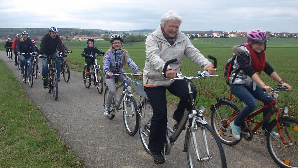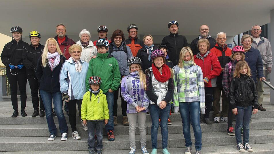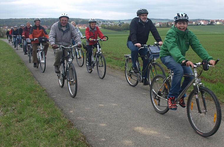 Bürgermeister Franz Kuhn (Bürgerblock Oerlenbach) und Günther Gößmann-Schmitt über 22 Kilometer zu. In der Gruppe waren Jung und Alt vertreten, darunter Erwin Schott, mit 78 Jahren ältester Teilnehmer, und der fünfjährige Hannes Federlein, der mit seinem Kinderfahrrad gut mithielt. Alle 21 Starter erreichten sicher den Ausgangspunkt.
