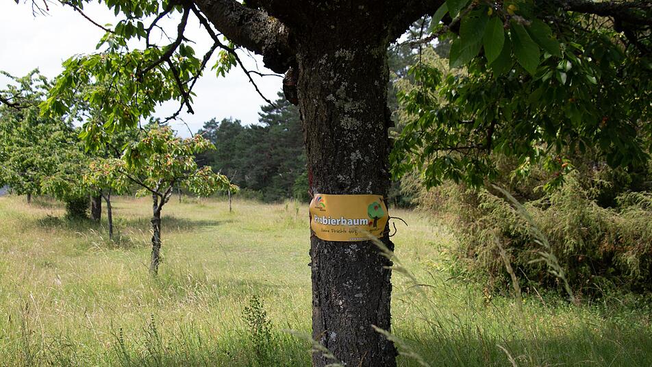 Nun tragen diese Kirschbäume und viele weitere Obstbäume die gelbe Probierbaum-Banderole mit dem Slogan: "Meine Früchte darf man genießen". Im Gebiet der Allianz Kissinger Bogen und der Allianz Fränkisches Saaletal gibt es zahlreiche Streuobstwiesen. "Die Früchte sind oftmals im Überfluss vorhanden - nur werden sie leider nicht oder nur teilweise verwertet, da das Pflücken oder Aufsammeln grundsätzlich nicht erlaubt ist", nennt Stephanie Kunder, Managerin der Allianz Kissinger Bogen als Problem.