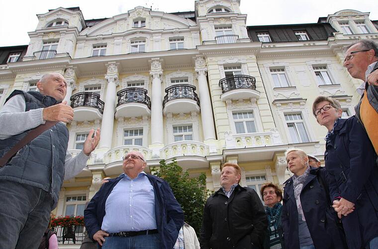 Über dieses wertvolle Erbe und die Geschichte des Ortes berichtete Stadtführer Walter Dotzauer: Zahlreiche berühmte Persönlichkeiten - vom Namensgeber Kaiser Franz II bis Goethe - besuchten die Stadt. Die Blütezeit habe sie vor dem Ersten Weltkrieg erlebt, aber die meisten Besucher habe es nach dem Zweiten Weltkrieg gegeben. "So viele Gäste wie in der Zeit des Sozialismus wird es nie wieder geben", war sich Dotzauer sicher. Allerdings hätten die Gäste damals auch kostenlos Urlaub gemacht, es habe sie also nicht gestört, dass die Toiletten auf dem Gang waren und das Dach undicht war. Nach der Wende, die in Tschechien Samtene Revolution genannt wird, sei zwar viel investiert worden. Trotzdem gibt es in Franzensbad aber noch jede Menge historische Gebäude, die mitten im Zentrum leer stehen.