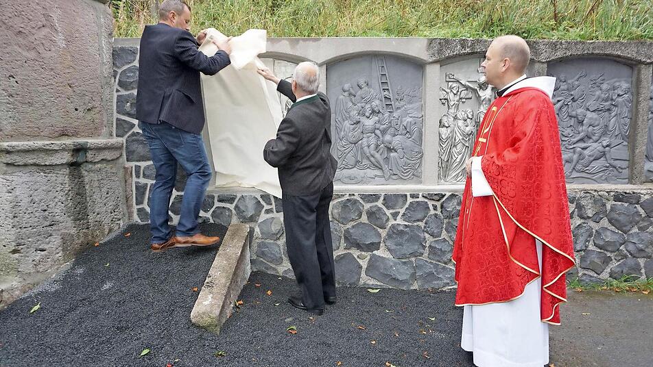 Pater Stanislaus weihte die beiden neuen Stationen am Kreuzberg. Gefertigt wurden die bislang fehlenden Tafeln von Günter Metz.