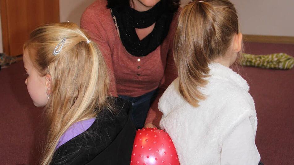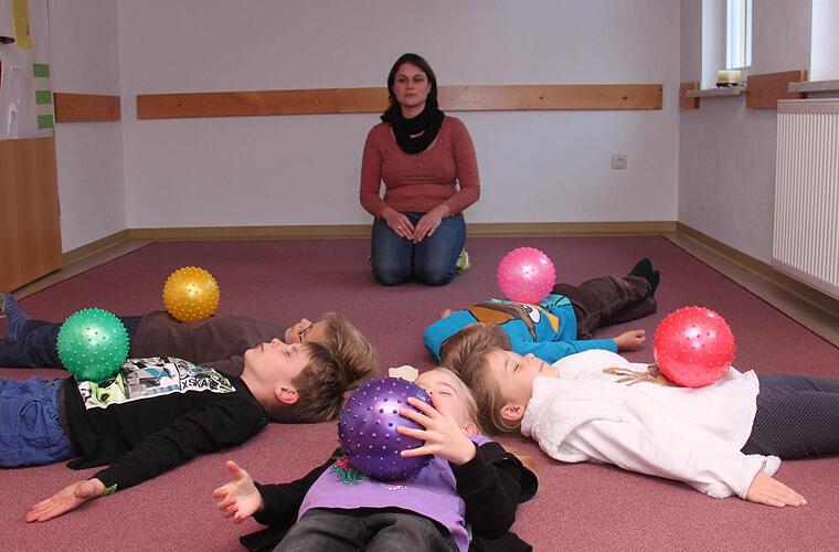 "Legt euch den Ball locker auf den Bauch. Jetzt versucht so gleichmäßig ruhig wie möglich zu atmen, so dass der Ball liegen bleibt." Julia Bauer gibt fünf Kindern Anweisungen. "Die Übung geht bei kleineren Kindern auch mit Kuscheltieren", erklärt sie. Der Raum ist gut beheizt, sanftes Licht und leise Musik sorgen für eine angenehme, ruhige Atmosphäre. Dem einen oder anderen rollt der Ball weg.