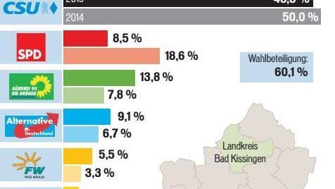 In Hammelburg wählten 62,7 Prozent der Wahlberechtigten. Die CSU kam auf 50,2 Prozent, die Grünen auf 16,6, die AfD auf 8,0, die SPD auf 7,9, die Freien Wähler auf 4,5, die FDP auf 2,6 und die Linke auf 2,2.