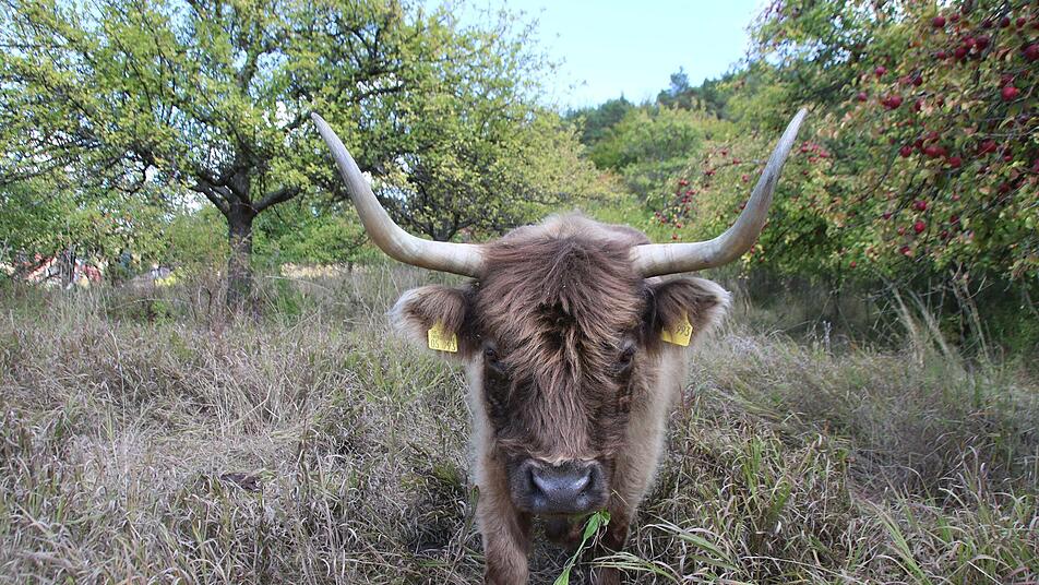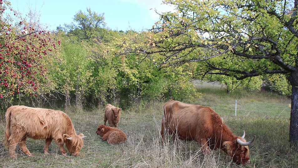 Florian Memmel und Edgar Thomas haben dazu 2015 die Firma Naturweide Saale/ Rhön gegründet. Beweidet werden Streuobstwiesen und Flächen, die der Landschaftspflegeverband aus Naturschutzgründen betreut. "Ohne Pflege würden sie in ihrer biologischen Vielfalt verarmen," sagt Edgar Thomas. Doch normales Weidevieh würde dort verhungern. Die hübsch anzusehenden Hochlandrinder dagegen sind anspruchslos und genügsam. Sie sorgen dafür, dass solche Wiesen nicht verbuschen.