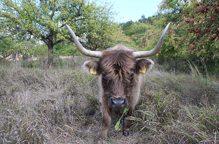Aellas Hörner sind ein bisschen furchteinflößend. Doch Florian Memmel ist ganz entspannt. Er weiß, dass die schottische Hochlandrind-Dame zwar eher scheu, aber ansonsten ganz relaxed ist, genauso wie ihre Chefin, die Leitkuh Valeta, die ein paar Meter weiter genüsslich am trockenen Gras kaut. Die beiden Kühe sind Teil eines 90 Tiere zählenden tierischen Landschaftspflegeteams. Wo sie weiden, braucht es keine Motorsense. Die Kühe sind zwar nicht so schnell wie motorisierte menschliche Einsatzkräfte, aber sie arbeiten schonend und sehr zuverlässig. Ganz nebenbei sorgen sie für die natürliche, ausgewogene Düngung, weil sie nie sehr lange auf einem Standort stehen.