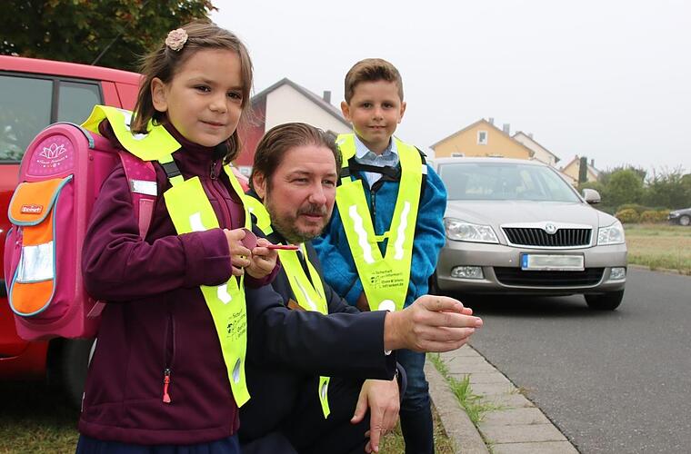 "Unsere Kinder müssen auf die Teilnahme am Straßenverkehr vorbereitet werden", sagte Verkehrserzieher Matthias Kleren. Es sei kein Zufall, dass zwei Drittel aller Schulweg-Unfälle im Winter-Halbjahr passieren: "Dunkle Kleidung macht die Kinder unsichtbar", sagte der Polizist, und: "Sichtbarkeit bedeutet Sicherheit." Das belegte er mit konkreten Beispielen: Bei Nebel oder Dunkelheit sei ein dunkel angezogenes Kind etwa aus der Entfernung von einem halben Fußballfeld zu sehen, mit den Sicherheitsdreiecken erhöhe sich die Strecke auf drei Fußballfelder. Deshalb Klerens Rat: "Tragt die Dreiecke eure komplette Grundschulzeit über."