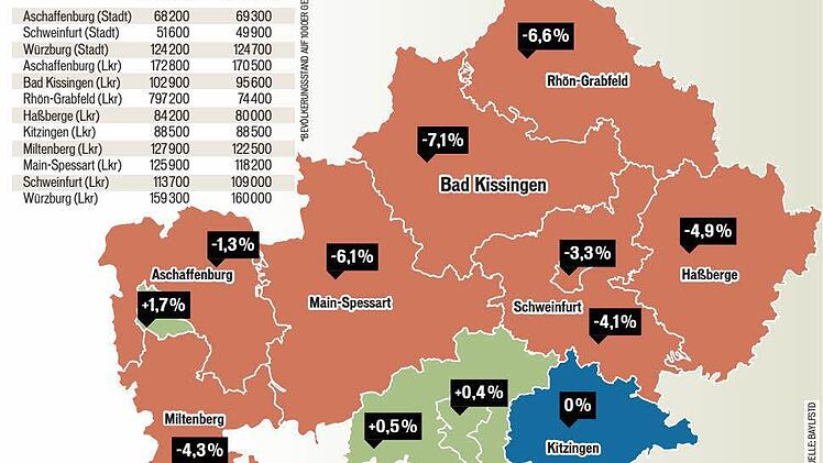 Klar abzulesen ist der Statistik vor allem ein Trend: Die Bevölkerung in ländlichen Gegenden geht zurück und wird immer älter. Lediglich für die kreisfreien Städte Würzburg, Schweinfurt und Aschaffenburg ist ein Wachstum vorhergesagt (siehe Grafik). Der Landkreis Kitzingen stagniert immerhin, bisher wurden 2,0 Prozent Rückgang prognostiziert.