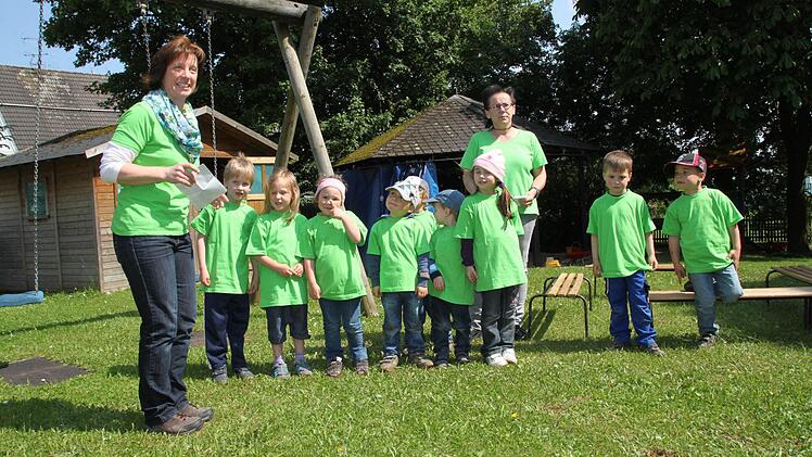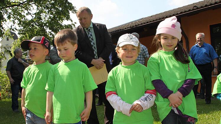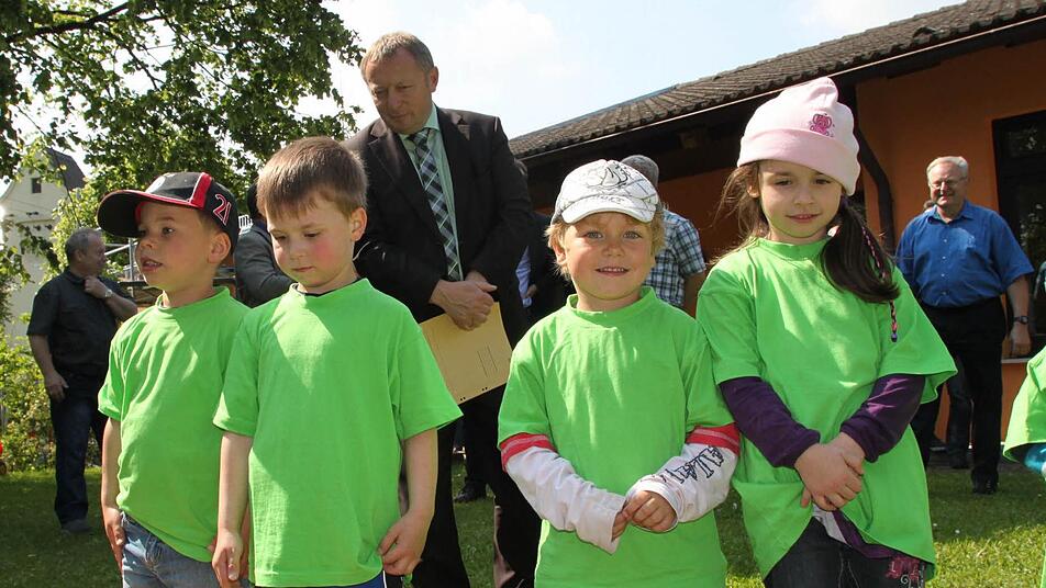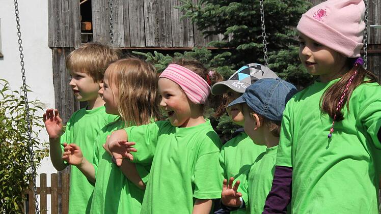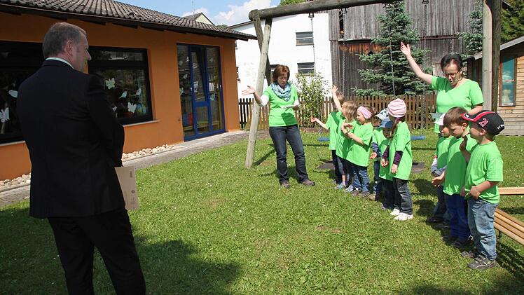 Die Zukunft hatte sich in Grün gekleidet und wartete auf Landrat Thomas Bold (CSU). Auf ihrem Rücken stand "Kindergarten Abenteuerland Geroda". Die Kleinen hatten fleißig geübt und sangen der Besuchergruppe ein Ständchen. Auswendig. Und sogar mit Bewegungen dazu. Bürgermeister Manfred Emmert (Freie Wähler) weiß genau: Die Gemeinde schrumpft.