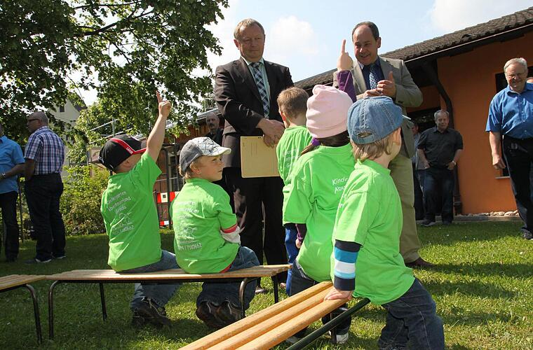 Noch nicht verputzt, aber schon mit einem Dach steht er da, der neue Anbau an den Kindergarten, in dem ab Herbst Platz für sechs bis acht Kleinkinder sein wird. Stolz führt der Bürgermeister seinen Gast auf die Spielwiese. Dort werden die beiden schon erwartet.