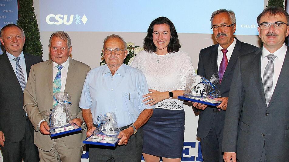 Anschließend wurden Egid Thomas, Arthur Stollberger und Altbürgermeister Günter Kiesel für ihre Verdienste im CSU-Ortsverband ausgezeichnet. Alle drei waren lange Jahre in der Kommunalpolitik aktiv tätig und engagierten sich in der CSU. Unter anderem bekamen sie auch bayerische Löwen aus Porzellan überreicht.
