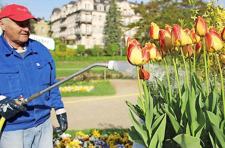 Es ist noch frostig kalt, als Peter Wehner von der staatlichen Kurgärtnerei die Stiefmütterchen, Tulpen und Rosen gießt. Was an Wasser von oben fehlt, das kommt jetzt aus Wasserfässern. Es ist zu trocken und die wenigen Regentropfen der letzten Tage haben den Durst der Blumen längst nicht gestillt. "Man muss einfach dahinter sein", meint Peter Weh ner.
