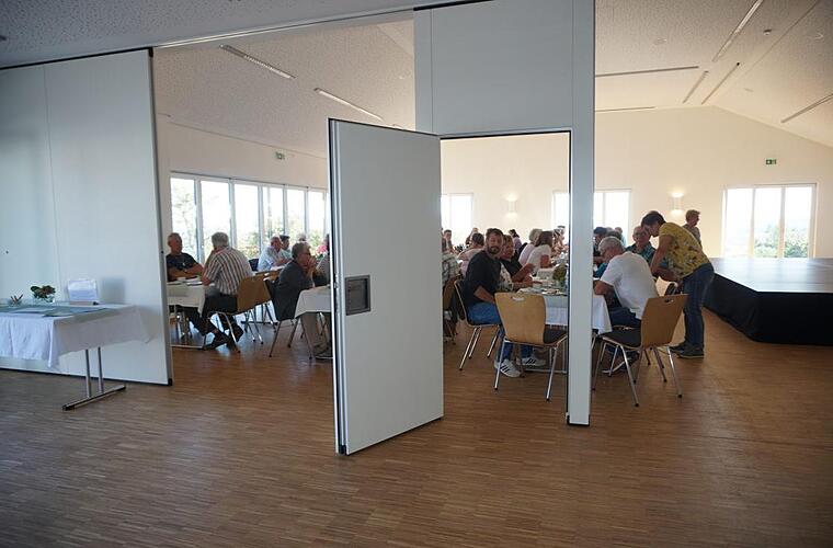 Einladend ist das Haus mit dem Foyer und der Garderobe, einem  Lichtkonzept, das sich auch am Tresen widerspiegelt. Doch vor allem ist  das Gebäude auch funktional, denn der Versammlungsraum lässt sich in drei  Bereiche einteilen.