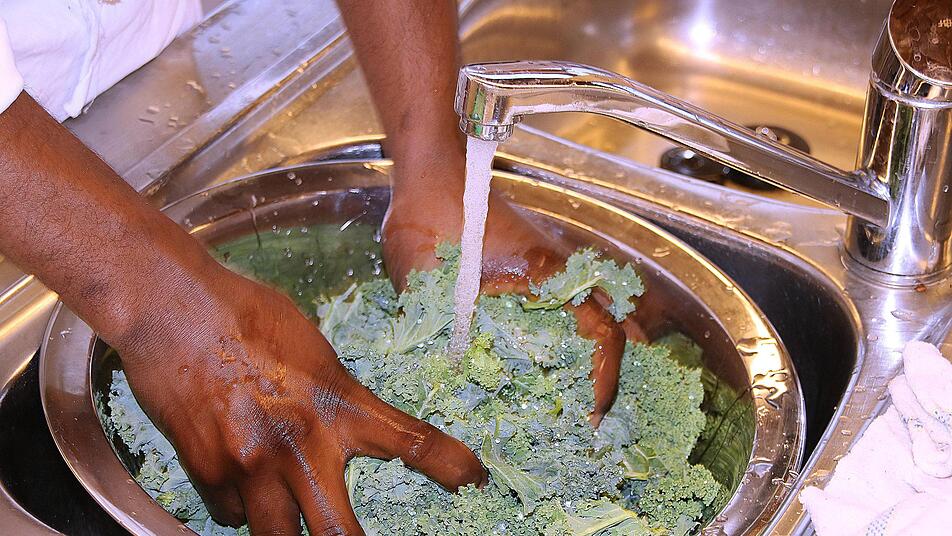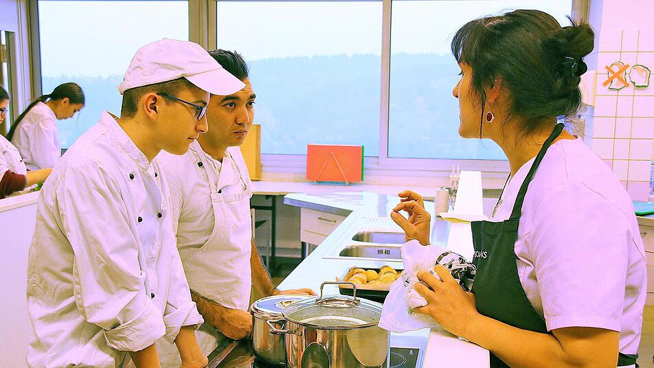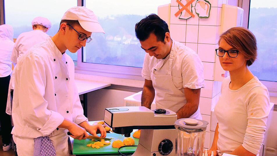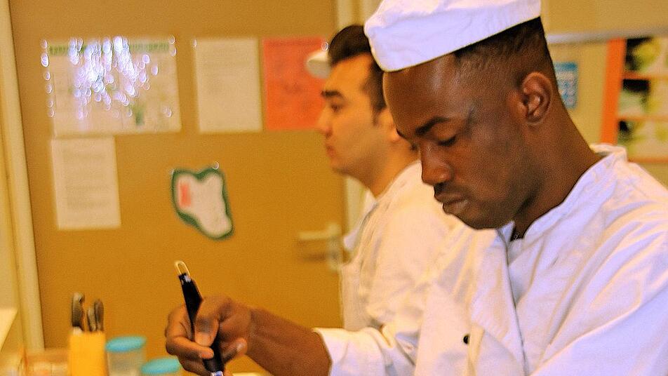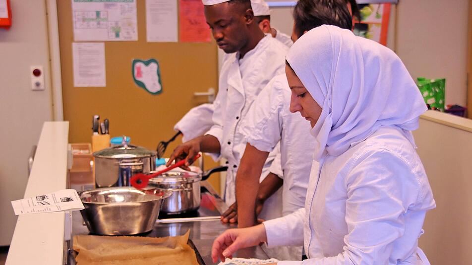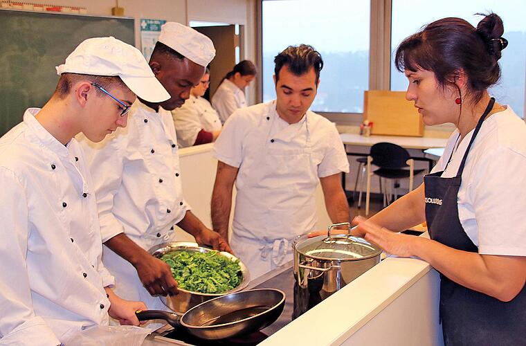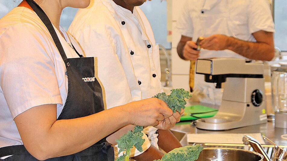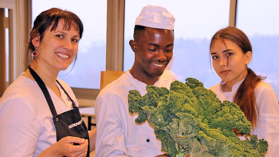 In der großen Küche der Berufsfachschule für Ernährung und Versorgung herrschte reger Betrieb, als das gute Dutzend Studierende, die aus mehreren Ländern kommen, sich mit der Zubereitung des Grünkohls beschäftigte. So demonstrierte Katharina Zeller wie das Gemüse, nachdem die harten Rippen entfernt sind, geschnitten und gewaschen wird. Hadi aus Gambia lernte das Blanchieren, das heißt, das Gemüse wird in heißem Wasser ganz kurz gekocht und dann mit kaltem Wasser abgeschreckt. Der junge Mann begriff sehr schnell, wie das funktioniert.