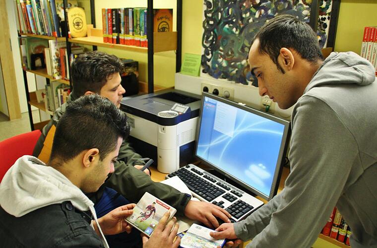 Auch Najeeb Kakar wohnt in Stangenroth. Er hat sich mit dem Ägypter Elgude Ahmed und dem Afghanen Nasdullah Baber - beide wohnen in Bad Bocklet - um den PC geschart, nachdem Frau Reichert ihnen erklärt, dass man in der Bücherei auch ins Internet gehen und sogar drucken kann. Dass die Jugendlichen so aufmerksam und lernwillig sind, freut die Herrin über 25 000 Medien: "Die dürfen alle gern wiederkommen".