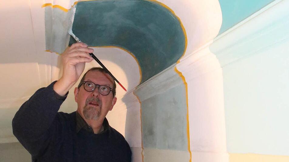 Alleine für die Treppenhäuser mussten fünf verschiedene Wandfarben mit der Denkmalpflege abgestimmt werden. Dazu legte Restaurator Harald Straßburger von der Firma "Fuchs und Gierke" Musterflächen an Decke und Wand an: "Hier sieht man die endgültige Farbfassung", sagt er, während er auf die noch feuchten Flächen zeigt. Die Farbtöne von Decke, Kehle, Profil, Wandrahmen und der Wandfläche selbst sind aufeinander abgestimmt. Entsprechend dem historischen Befund werden in den beiden Haupt-Treppenhäusern in Zukunft Grüntöne vorherrschen.