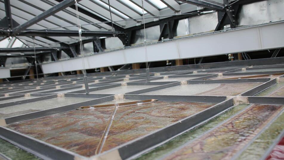 Die erste Buntglasdecke im westlichen Treppenhaus ist bereits vollständig eingebaut, die zweite im östlichen Treppenhaus soll kommende Woche folgen. Um die historischen Scheiben herum ist alles modern: Ein Oberlicht mit Dreifach-Verglasung, bestem Wärmeschutz, hagelsicher und mit geriffelten Scheiben, damit das Licht diffus auf die bemalten Scheiben trifft, schützt die Glasdecke von oben. Darunter wird noch ein engmaschiges Nylonnetz gehängt, das Besucher vor herabfallenden Glassplittern schützt.