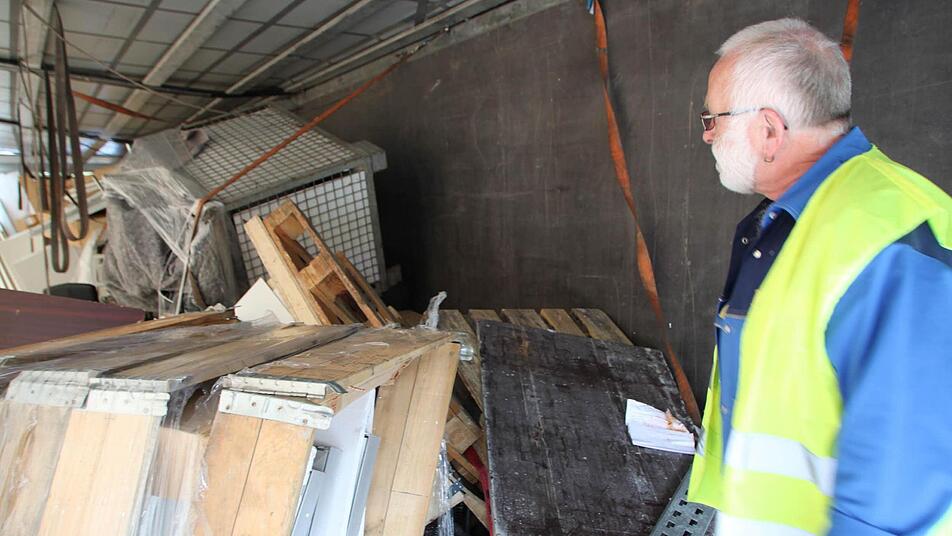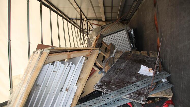 Container geordert Und noch etwas machte die Bergung kompliziert: Der Lkw hatte Möbelteile, Holzkisten, Bretter, Regalsysteme und ähnliches geladen. "Das ist ja alles kaputt", stellte Rudolf Wehner vom Abschlepp-Unternehmen aus Uttrichshausen fest und orderte erste einmal Container, um das Material fortzuschaffen.
