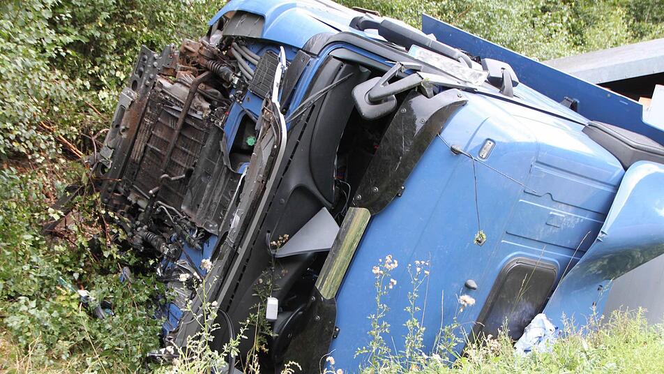 Ein Kreuz an einer Kette, daneben eine Sonnenbrille und ein wenig ausgelaufenes Öl - in der Fahrerkabine des umgestürzten Lkw sah es wüst aus. Der Sattelzug war am Montag, 2. September, von der Autobahn A7 abgekommen, nachdem er auf den vor ihm fahrenden Laster gefahren war. Beide Fahrer kamen mit Verletzungen ins Krankenhaus. Der Sachschaden ist erheblich, kann von der Polizei allerdings noch nicht konkret benannt werden.