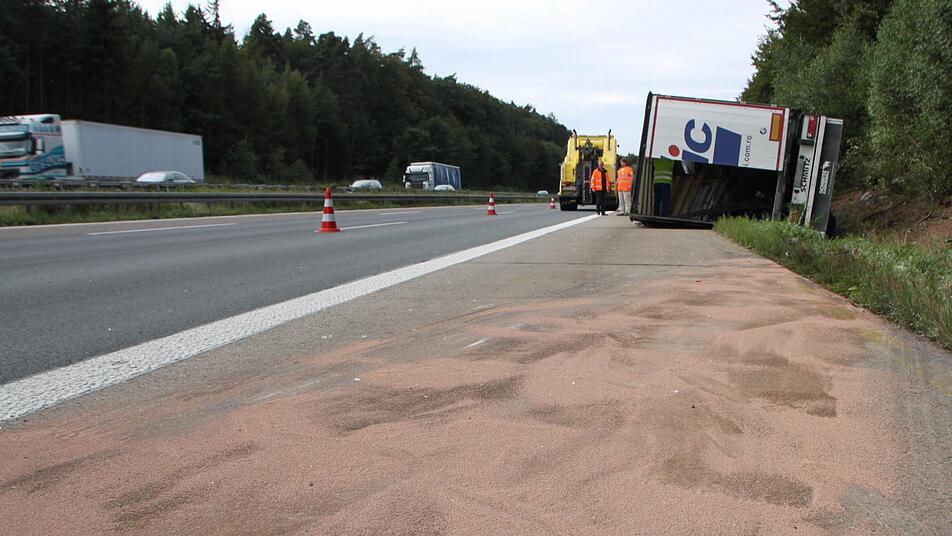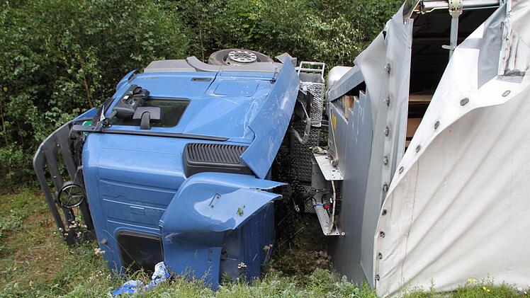 Der Unfallverursacher fuhr um 15.03 Uhr auf den vor ihm fahrenden Lkw auf, der nur mit etwa 60 Kilometer pro Stunde auf der Rhönautobahn zwischen den Anschlussstellen Bad Kissingen/Oberthulba und Wildflecken unterwegs war. Der Fahrer, der aus dem Landkreis Bad Kissingen kommt, hatte 20 Tonnen Kies geladen. Kurz hinter der Wildbrücke passierte der Zusammenstoß. Dabei kam der Unfallverursacher nach recht von der Fahrbahn ab, fuhr noch etwa 30 Meter an der Böschung entlang und kippte dann um, und zwar in Richtung Autobahn. Für den nachkommenden Verkehr war das zwar kein Problem, allerdings gestaltete sich die Bergung schwierig, da ansteigendes Gelände das Aufrichten des Sattelzuges erschwerte.