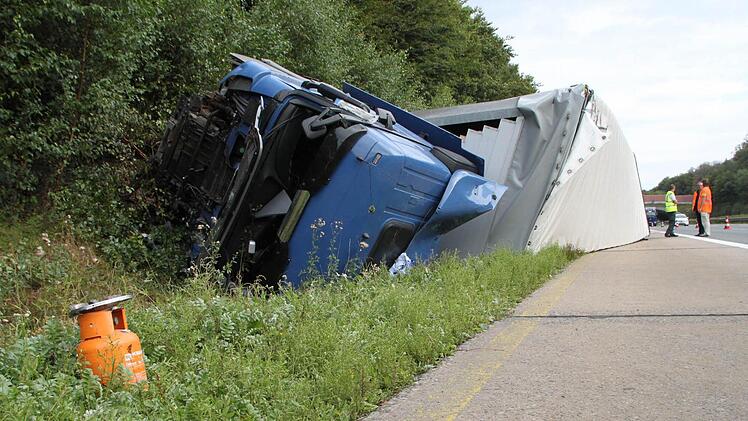 Zwei Lkw fuhren am Montag auf der A7 aufeinander. Einer von beiden kippte so ungünstig um, dass die Bergung ziemlich kompliziert war. Das lag auch an der Ladung.