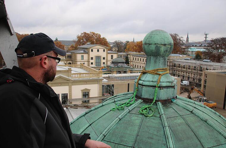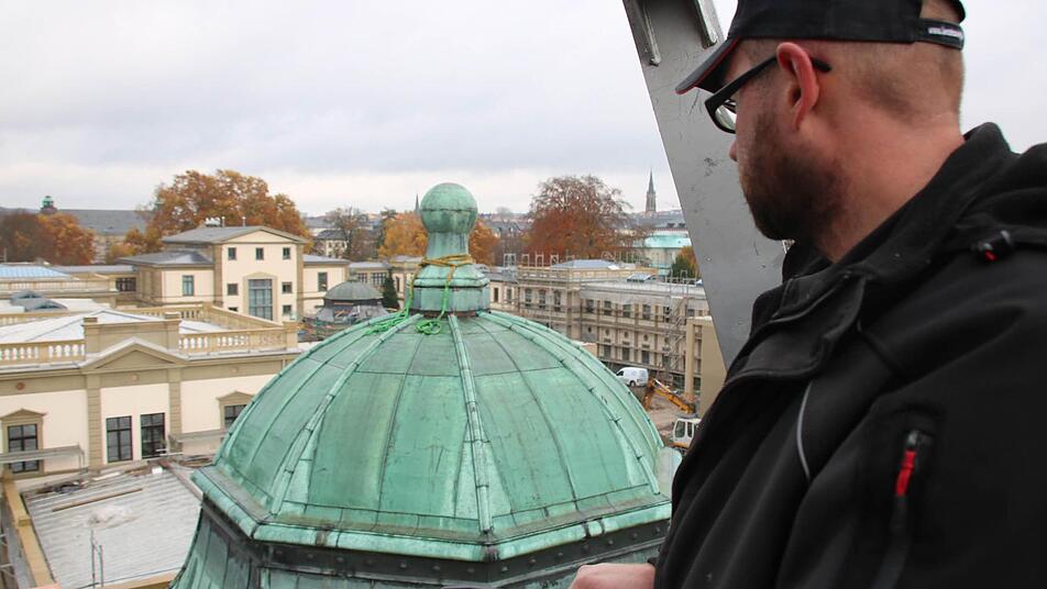 Mit dem Abbau der Gerüste beginnen sofort die Erdarbeiten im Außenbereich: Im hinteren Teil des Innenhofes geht es schon bald ans Pflastern und die Pflanzung der beiden Amberbäume. Im Innenhof und entlang der Westseite laufen Kanalarbeiten: Wegen Schäden an den alten Kanälen wird die Entwässerung komplett erneuert - und strikt getrennt: Das Regenwasser von den Edelstahldächern darf direkt in die Saale fließen. Das Wasser von den Kupferdächern sowie die Schmutzwässer werden neu an den Sammler in der Bismarckstraße angeschlossen. "Deshalb gibt es auch Einschränkungen bei der bisherigen Baustellen-Zufahrt", sagt Full.