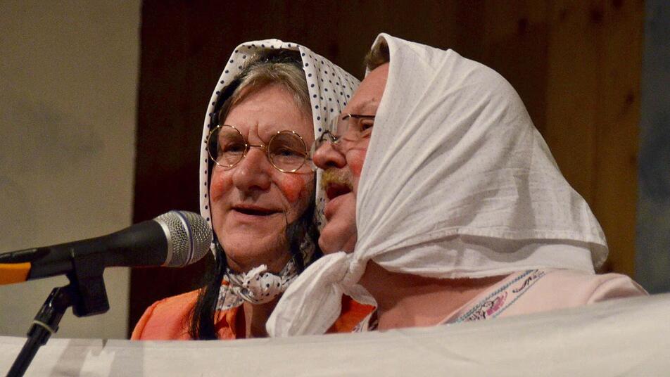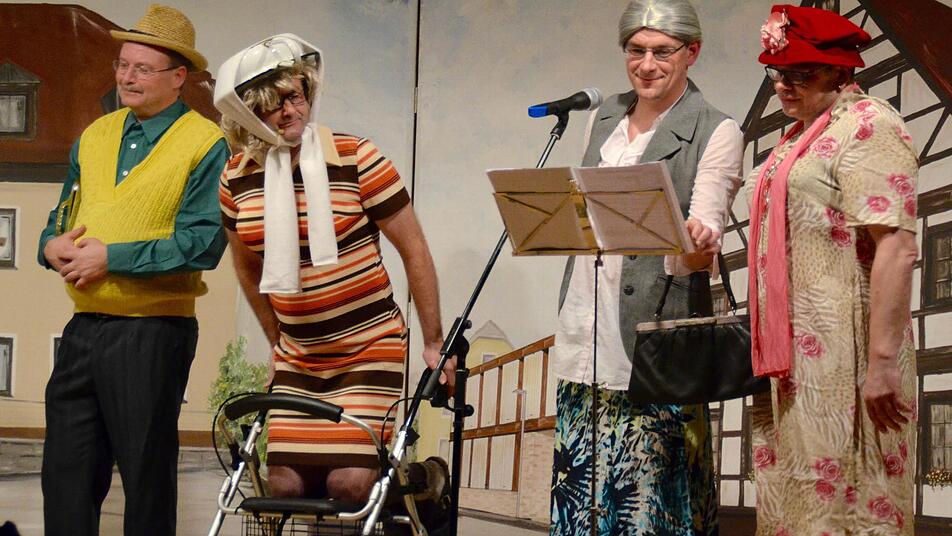 Diesmal kamen die verbliebenen Kindsköpf als erzählende Rentnertruppe auf die Bühne. Die hatte einen Ausflug vom neuen Zuhause im Seniorenheim an der Strengen Tür zum Marktplatz unternommen und musste nicht nur mit der Begleit-Krankenschwester (Klaus Wiesler), sondern auch mit allerhand Turbulenzen kämpfen. So hatte sich Thekla (Tony May) gleich nach dem Abmarsch nach Wollbach verirrt und musste samt Rollator "die Höll" hinunterbrausen.