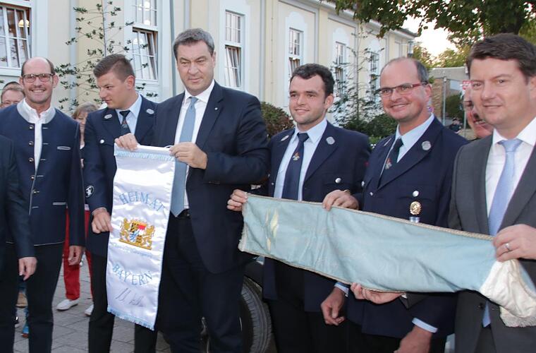 "Der ist schon so kaputt, dass wir nach München geschrieben und um Ersatz gebeten haben", berichtet Gruppenführer Siegbert Scheller. Lange hörten die Feuerwehrleute aus dem Oberleichtersbacher Ortsteil nichts, am Donnerstag musste es dann schnell gehen: "Heute Morgen haben wir die Nachricht bekommen", erzählt Scheller. Also trommelte er einige Kameraden zusammen. Donnerstagabend überreichte Ministerpräsident Markus Söder (CSU) dann den neuen Wimpel. "Der ist zu schade für an die Fahne, der bekommt einen festen Platz im Schulungsraum", waren sich die Feuerwehrleute schnell einig.