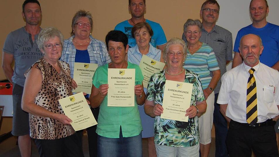 Nach einer mehrjährigen Pause wurden nun 74 der derzeit 180 Mitglieder des Sportvereins Hassenbach ausgezeichnet. Für 30-jährige Mitgliedschaft wurden Ingeborg Rost, Oswald Straub, Helma Wießner, Gertrud Wiegand, Karin Wehner, Gertrud Straub, Barbara Straub, Anita Straub, Mathilde Nürnberger, Irma Henz, Christa Groß, Ilse Hartmann, Bernd Günther, Marga Rehberg, Herbert Götz, Robert Groß, Heidi Grom, Anton Wießner, Volker Bieberich, Hermann Vogler, Anneliese Straub, Gabi Pentenrieder, Helga Kaufmann, Wally Huppmann, Frieda Henz, Toni Holzheimer, Rainer Wütscher, Otto Wehner, Wolfgang Henz, Joachim Henz, Irmgard Reuter, Margit Schmitt, Edwin Geiling, Frank Reuter, Matthias Reuter, Eleonore Metz, Heiko Grom und Sieglinde Schmidt geehrt.