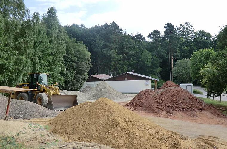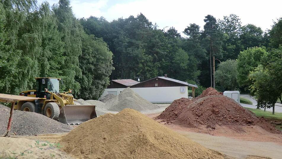 Der Parkplatz des Vereins gleicht seit Monaten einer Müllhalde. Die Baufirma, die derzeit die Straße im Ort baut, lagert dort Aushub, Schotter und Maschinen. Sowohl der Platz als auch die asphaltierte Zufahrt zum Sportheim wurden bereits stark beschädigt.