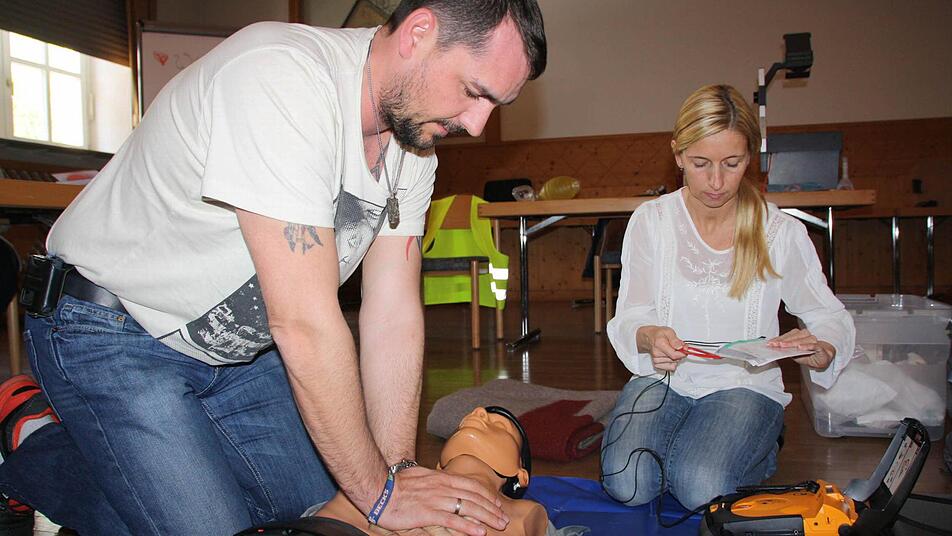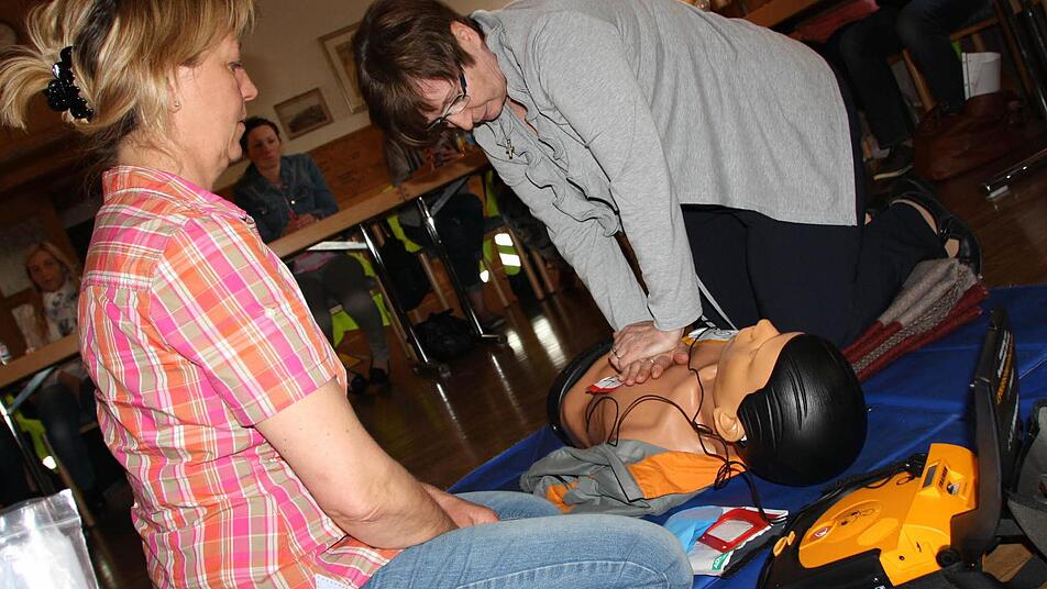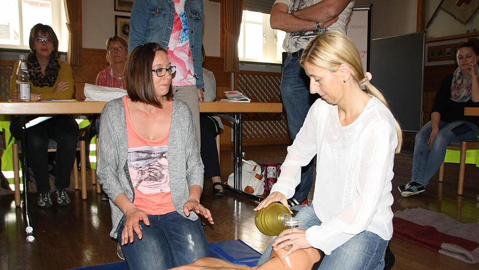 Im Rot-Kreuzsaal sitzt ein bunt zusammengewürfelter Haufen: Von der Drogerie-Fachverkäuferin über Altenpfleger bis zum Konstruktionsmechaniker sind viele Berufsgruppen vertreten. Sie alle haben ein Ziel: Ihre Kenntnisse in Erster Hilfe auffrischen. Das ist für betriebliche Ersthelfer alle zwei Jahre Pflicht. "Wir machen das beide schon seit Jahrzehnten", berichtet Marion Seufert (55) aus Wirmsthal, die mit ihrer Kollegin Brigitte Naujoks (53) aus Hammelburg den Kurs besucht. Trotzdem ist es heuer anders: "Die intensive Praxis hatten wir sonst nicht."
