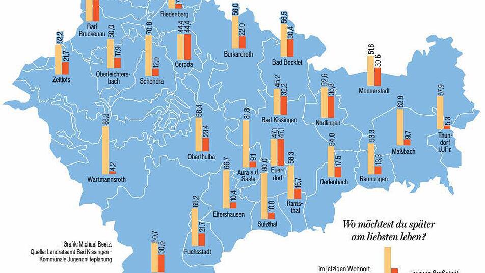 Sehr unterschiedlich sind nicht nur die regionale Verteilung der Heimatverbundenheit (siehe Grafik), sondern auch die Gründe für den Wegzug: So spielen bei den 12- bis 14 Jährigen die Einkaufsmöglichkeiten im Vordergrund, je älter die Jugendlichen werden, desto wichtiger werden die Aspekte Ausbildung, Karriere und Freizeitmöglichkeiten. "Da verschieben sich natürlich die Prioritäten mit dem Alter", weiß auch Melanie Schäfer, die beim Landratsamt Bad Kissingen die Auswertung der Ergebnisse koordiniert. Am Freitag stellt sie einige davon den Bürgermeistern vor.