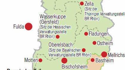 Entstehung Die Unesco hat 1991 die Rhön länderübergreifend als Biosphärenreservat (BR) anerkannt. Es umfasst derzeit 184 939 Hektar: 72 802 Hektar (39,4 Prozent) in Bayern, 63 564 Hektar (34,3 Prozent) in Hessen und 48 573 (26,3 Prozent) in Thüringen. Am BR beteiligt sind aktuell im Landkreis Bad Kissingen Bad Brückenau, Burkardroth, Geroda, Motten, Oberleichtersbach, Riedenberg und Wildflecken sowie im Kreis Rhön-Grabfeld Bischofsheim, Fladungen, Oberelsbach, Ostheim, Sandberg, Schönau, Hausen, Nordheim, Sondheim, Willmars und Stockheim.