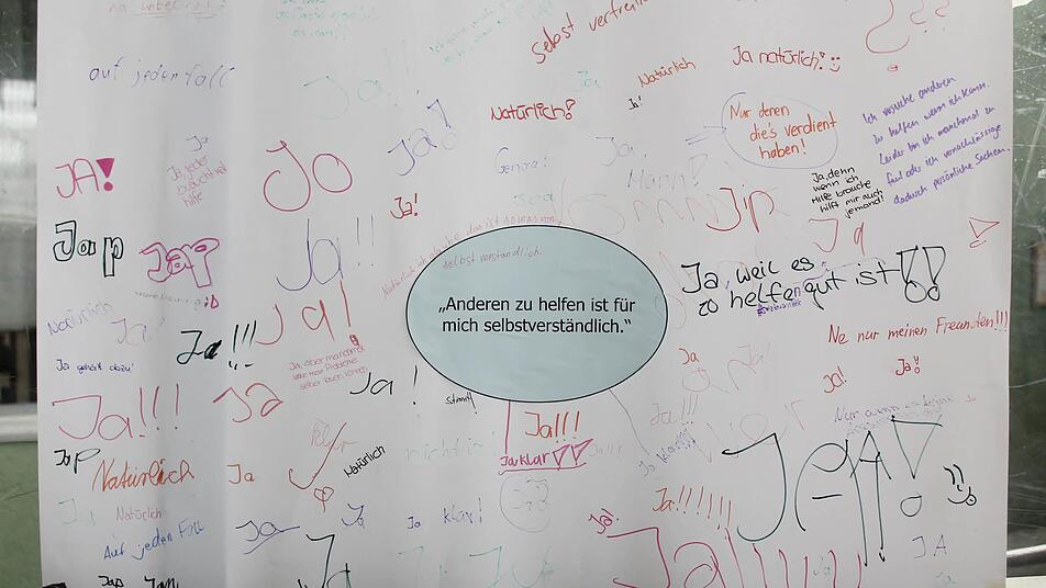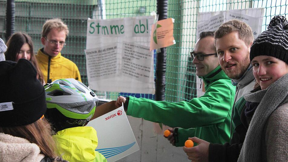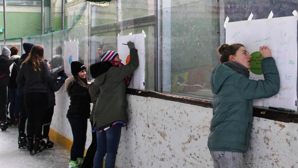 Auch Florian Drott vom BDKJ Rhön-Grabfeld und seine Helfer haben mitgewirkt, um für die Gala auf dem Eis ein kleines Programm zusammenzustellen, das kirchliche Aspekte spielerisch anspricht. Ein Bekenntnis zum Helfen wird in einer der Stationen abgefragt und auch kleine Spiele wie: "Was würdest du antworten, wenn Jesus Dich fragt...?" kommen gut an. An einer Station wird mit Tischtennisbällen abgestimmt, an einer anderen entsteht aus einzelnen Stellungnahmen eine Schreibgeschichte. Es herrscht eine heiter ausgelassene Stimmung im Kissinger Eisdom. Lässig wird von einer Station zur anderen gecarvt, die Könner lassen das Eis beim Stopp aufspritzen.