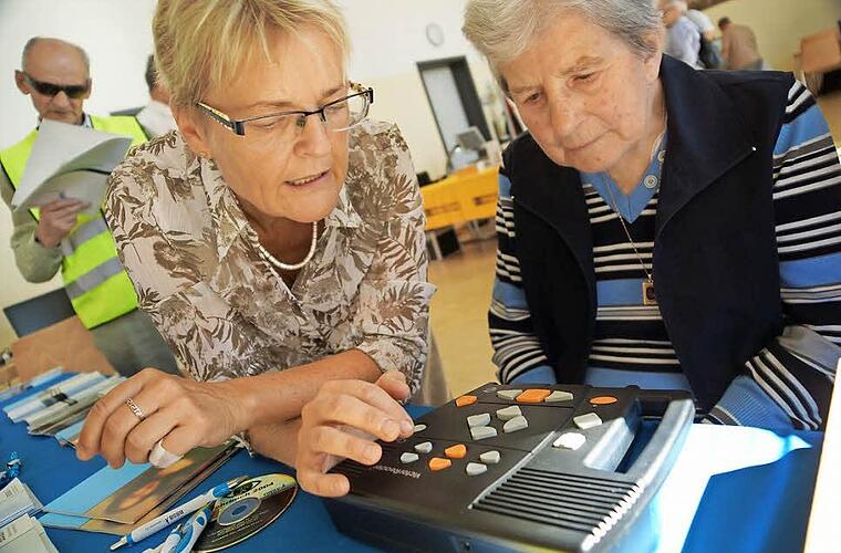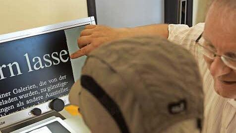 Für Betroffene wie Thunig hat Karl-Heinz Paul eine Messe im Pfarrzentrum organisiert. Acht Aussteller aus ganz Deutschland stellen technische Hilfsmittel für Sehgeschädigte vor. Neben Lupen, Kontrastbrillen und Uhren mit Sprachausgabe sind es vor allem verschiedene Lesegeräte. Sie vergrößern Zeitungsartikel, Prospekte und Dokumente auf einem Bildschirm oder lesen die gedruckten Texte vor.