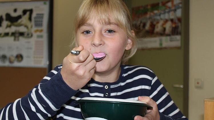 Hans weiß genau, was er will. "Dieser Joghurt ist lecker", verkündet der Achtjährige und streckt Erika Hüfner erwartungsvoll sein Schälchen entgegen. Und Bad Brückenaus Ortsbäuerin nimmt einen Löffel mit dem fruchtigen Waldbeer-Joghurt und gibt dem Zweitklässler eine ordentliche Portion Nachschlag. Hans zieht zufrieden ab. Aber hinter ihm warten noch viele hungrige Münder auf den leckeren - und vor allem gesunden - Joghurt.