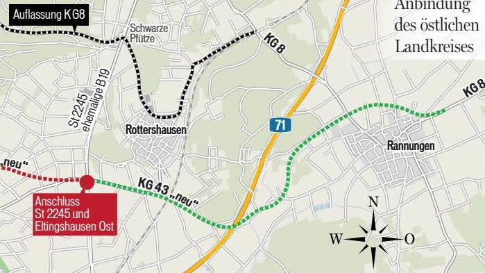 Eigentlich sollte die Verbindung zwischen Rottershausen und Rannungen bereits im Zuge des Baus der A 71 verbessert werden. Die Brücke über die Autobahn wurde vorsorglich bereits breiter gebaut, seitdem ist jedoch wenig passiert. Ursprünglich wurde auf der jetzigen Trasse, also in der Verlängerung des Ebenhäuser Weges geplant. "Wir haben auf Wunsch der Gemeinde Rannungen umgeplant", verwies Bold darauf, dass die Gemeinde im Zuge einer Flurbereinigung bereits sieben Hektar Fläche für die nördliche Anbindung an die KG 8 kostenfrei übertragen habe. Einen eindeutigeren Auftrag könne es nicht geben, deshalb sieht Bold die Rannunger auch in der Pflicht sich zu äußern: Falls sie die Straße so nicht mehr wollten, müssten sie allerdings damit rechnen, dass der Landkreis die Planungskosten in Rechnung stelle.