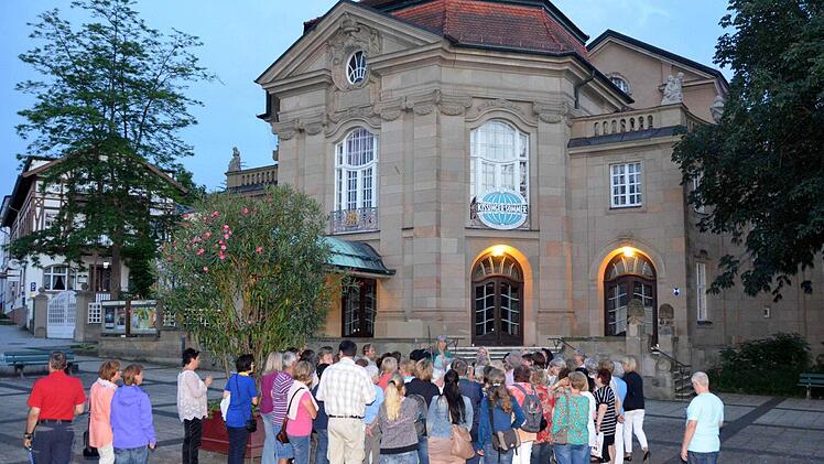 Udo Dickhage führt Gäste durch das abendliche Bad Kissingen. Die Tour geht vorbei an Feuertürmle und Theater und endet bei Peter Heil, dem Retter der Stadt in den Schwedenkriegen.