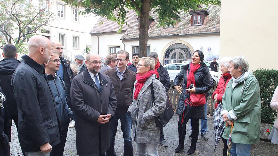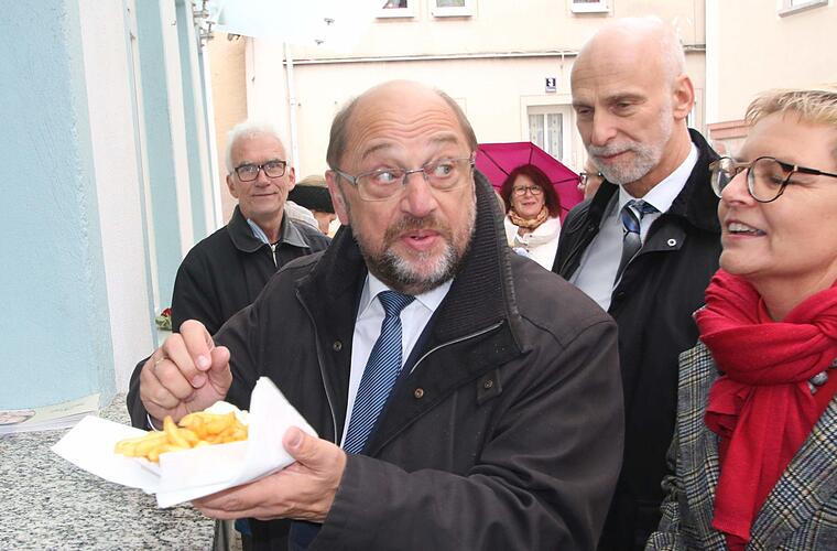 Martin Schulz gilt als Liebhaber einer guten Bratwurst. Deshalb endete der Rundgang nach eineinhalb Stunden, eine halbe Stunde mehr als geplant, am Imbiss in der Mühlgasse. Dort stärkte sich der Bundestagsabgeordnete mit einer Bratwurst mit Pommes. Die beste Bratwurst hätte er bisher in Saarlouis gegessen, ließ er verlauten. Man darf gespannt sein, was er in Zukunft erzählt. "Ich zahle natürlich selber, ihr könnt den anderen die Bratwurst bezahlen", wehrte er ab, als jemand seine Rechnung übernehmen wollte. Nächste Station des Politikers war der künftige geografische Mittelpunkt Europas in Gadheim, einem Ortsteil von Veitshöchheim im Landkreis Würzburg. Dort hielt er eine Rede zur Zukunft der EU. Bislang liegt die geografische Mitte in der Gemeinde Westerngrund im Landkreis Aschaffenburg. Wenn Großbritannien die EU verlässt, wandert sie in Richtung Osten nach Gadheim, bleibt aber immerhin in Unterfranken.