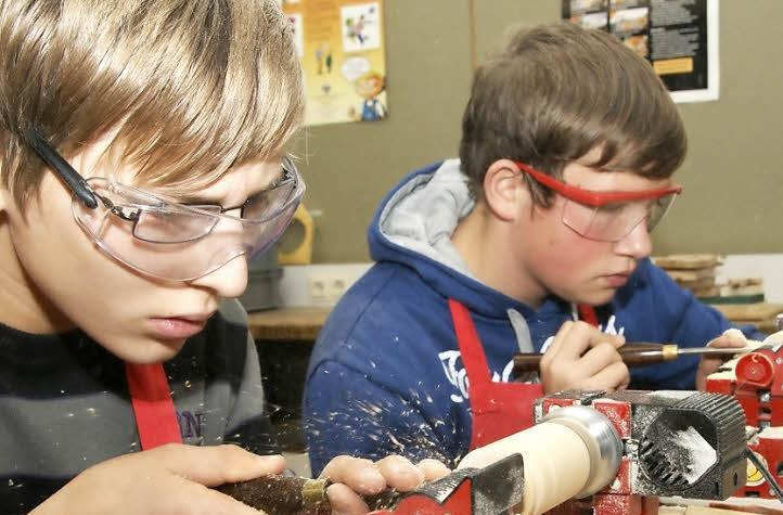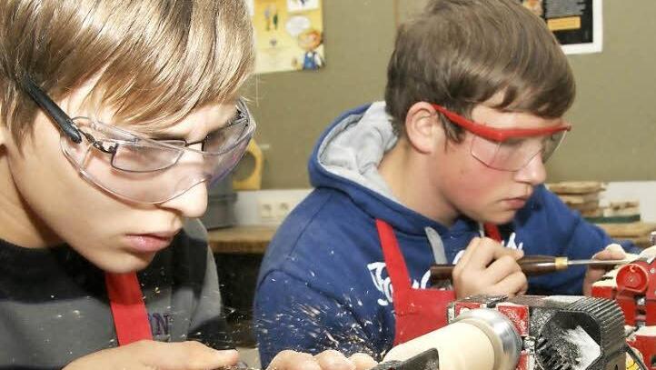 Schüler der achten, neunten und zehnten Klassen der Mittelschule üben das Drechseln. Es soll nicht die letzte Begegnung mit diesem alten Handwerk sein.