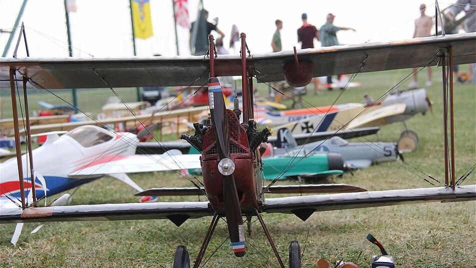 Bei Ralph Dietrich aus Nürnberg hat das amerikanische Postflugzeug "Jenny", das für den Einsatz als Kampfflugzeug im Zweiten Weltkrieg zu träge war, Gefallen gefunden. Sein Nachbau im Maßstab 1:6 hebt sich nahe der Windräder stolz in die Lüfte.