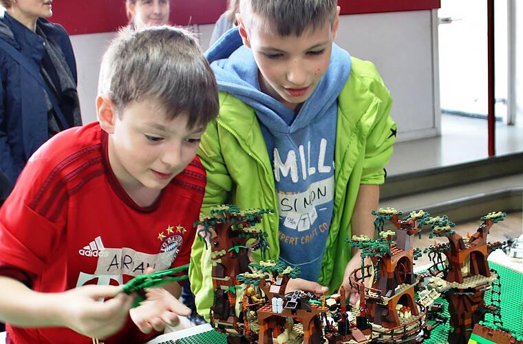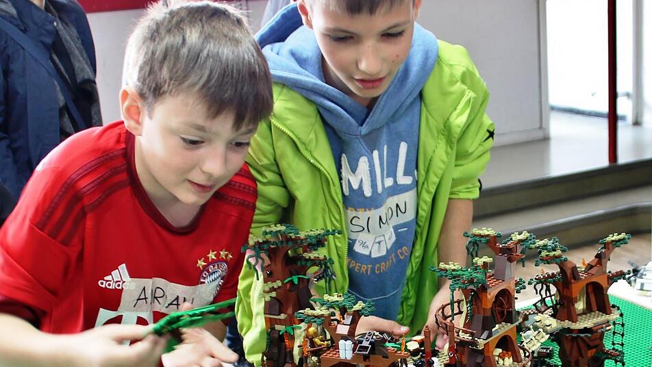 Keanu aus Arnshausen ist zehn Jahre alt und Star-Wars-Fan. Er hatte sich vorgenommen, den stelzbeinigen Allterrain-Angriffstransporter - kurz AT-AT - zu bauen, blätterte in der Vorlage, suchte die Teile zusammen, steckte zwei Tage Hunderte kleine Teile zusammen und konnte zur Präsentation der Galaxien am Freitag seiner Mutter stolz den imposanten Kampfläufer mit seinen vier Kanonen vorstellen. Viele Kinder, darunter Lukas, Adrian und Simon, fanden sich - gewünschter Nebeneffekt beim Ferienprogramm - spontan zu kleinen Gruppen zusammen. Die Jungs wollten den berühmten "Waldmond Endor" erschaffen: "Dort findet die letzte Schlacht des galaktischen Bürgerkriegs statt", erklärt Simon mit Feuereifer, zeigt auf die Savannenlandschaft, hat "Ewoks" in die Waldhäuser und die bewohnten Bäume gesetzt. Die drei aufgeweckten Jungs haben eine tolle Landschaft gestaltet, und als ein unvorsichtiger Besucher einen Baum umstößt, baut Simon das fragile Gebilde wieder an der gleichen Stelle auf.