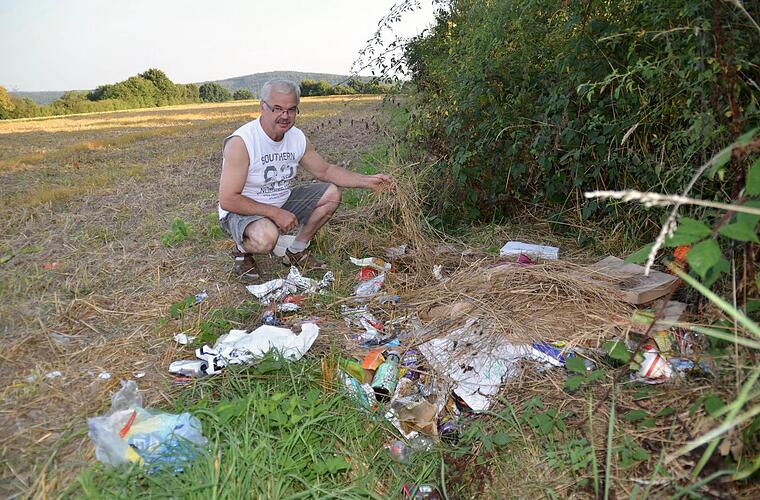 Benno Keßler kann es kaum glauben. Direkt an seinem Acker auf dem Mühlberg liegt Müll. Nicht einfach nur etwas Unrat, achtlos hingeworfen. Nein, an dem Feldrand hat jemand vermutlich ganz bewusst seinen Partymüll abgeladen. "Man hat sich sogar die Mühe gemacht, ihn extra hierherzubringen, etliche Meter abseits vom Weg", sagt er.