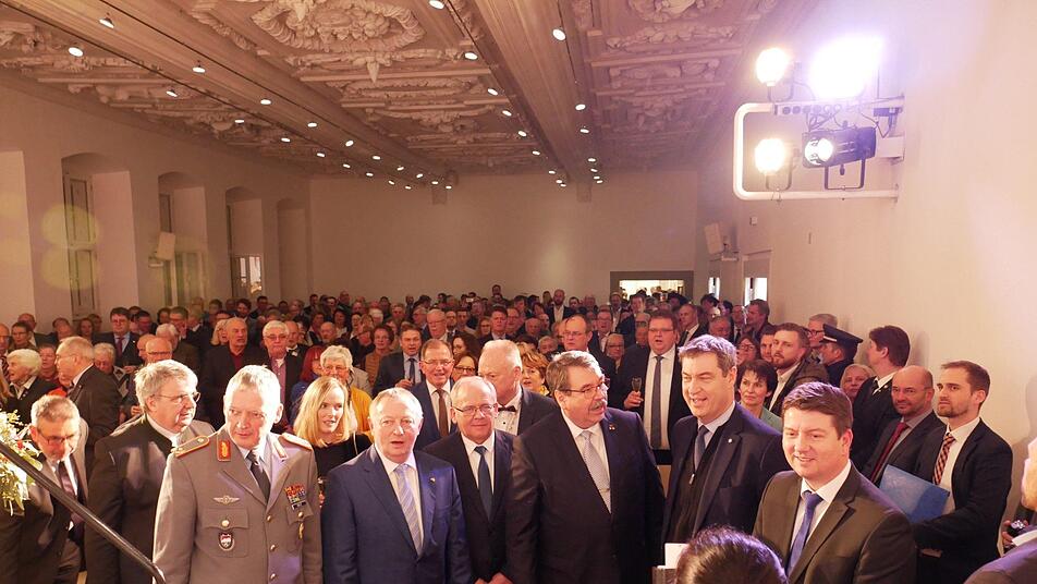 39 Minuten sprach Markus Söder beim Neujahrsempfang über Bayern, Franken und Bayerns künftige Position innerhalb der globalen Welt. Rund 400 Gäste hörten seine Festrede im historischen Stucksaal, der alten Aula des früheren Gymnasiums. Es waren so viele Gäste, dass einige im Saal nicht einmal mehr einen Stehplatz fanden und lieber an der Tür stehend das Geschehen verfolgten. Im launigen Plauderstil zog Markus Söder die Zuhörer schnell auf seine Seite. Termine in Franken seien für ihn emotionaler, weil dort sein Herz höher schlage, bei einem solchen Jubiläum zusätzlich, stellte er fest.