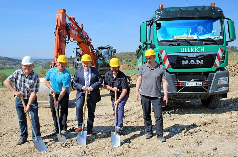 Die Wendeplatte am Ende der Straße "An der Centleite", Höhe Hausnummer 19, wird in wenigen Monaten überflüssig. Dann führt die Fahrbahn weiter nach Westen in das neue Baugebiet "Centleite II", für das vor zwei Wochen die Erdarbeiten für die Erschließung begonnen haben. Hier sollen 23 neue Bauplätze für Einfamilienhäuser entstehen. Der offizielle Spatenstich fand jetzt statt, während im Hintergrund schon die Bauarbeiter am Werk waren und die Bagger und Raupen des Elfershausener Bauunternehmens Ullrich Spuren in der Landschaft hinterlassen haben.