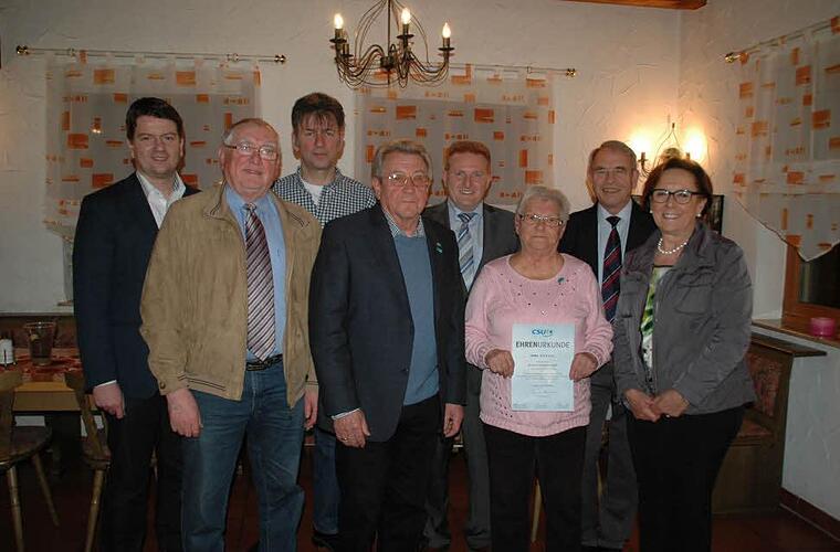 Aus den Händen des Landtagsabgeordneten Sandro Kirchner und der Bezirksrätin Karin Renner nahm Willibald Schneider die CSU-Ehrennadel mit Brillant für seinen 50-jährige Parteizugehörigkeit entgegen. Sichtlich bewegt schilderte Schneider seine Gründe, der CSU beizutreten. Wie er erzählte, gab es 1965 viele Tendenzen, die DDR anzuerkennen und somit zwei deutsche Staaten endgültig und unwiderruflich zu manifestieren. Das wollte er unbedingt verhindert sehen, und vor allem die CSU habe sich gegen diese Pläne vehement gewehrt, sagte Schneider. Auch ansonsten habe die CSU immer die gleichen Werte vermittelt, für die auch er stehe, so Schneider weiter. In dieser Partei habe er sich immer gut aufgehoben gefühlt, und er sei ihr deshalb sehr dankbar. Immer wieder habe es dabei herausragende Ereignisse gegeben, etwa als Franz-Josef Strauß 1975 circa 13 000 Parteifreunde zu seiner gemeinsamen Geburtstagsfeier mit Parteijubiläum in die Münchener Olympiahalle eingeladen hatte und er dabei sein durfte. Geehrt wurden außerdem: für 20 Jahre: Oliver Gleichmann, 25 Jahre: Emma Wenzel, 30 Jahre: Kurt Heim, Rainer Krauser, 35 Jahre Otmar Marisch.