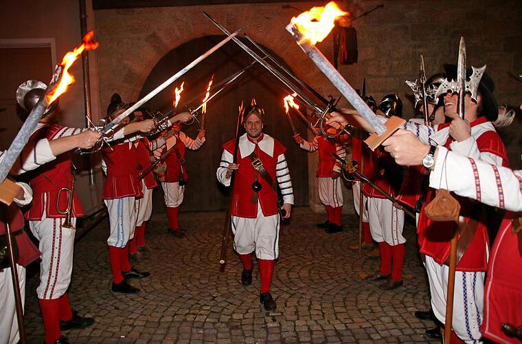 Mit Trompetenklang, Fackeln und bewaffnet mit Hellebarden zog am Samstagabend ein respektabler Trupp Heimatspiel-Stadtknechte in mittelalterlichen Uniformen vom Hotel "Bayerischer Hof" zu einem Haus am Anger und wieder zurück. Klar, dass in vielen Häusern die Fenster aufgerissen wurden und die Bürger leicht irritiert hinaus auf die Straße schauten, um zu erfahren, was da los war. Doch der Anlass für das Spektakel war völlig harmlos: Die Stadtknechte holten einen der ihren, Christian Zerzer, vom Elterhaus ab und geleiteten ihn in feierlichem Zug zum "Bayrischen Hof." Im Keller des Hotels wurde danach ausgiebig gefeiert, dass Zerzer nach genau 20 Jahren die Rolle des Michel Stapf im Heimatsspiel aufgibt.