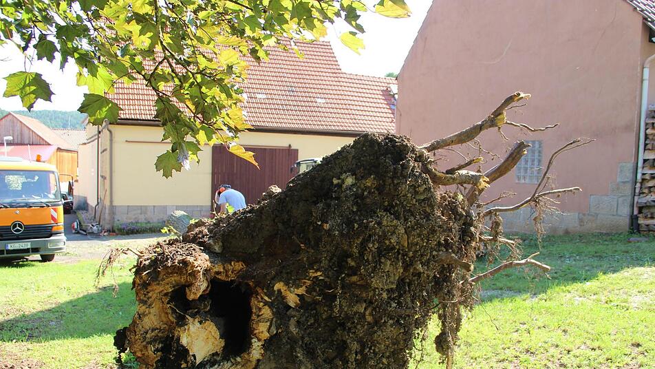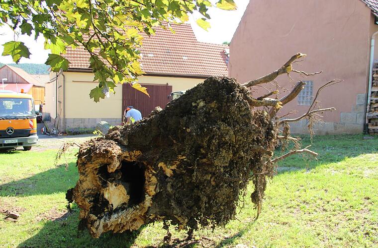 Anwohner hatten in der Nacht einen Schlag gehört und am Morgen den umgefallenen Baum entdeckt, erklärt der städtische Mitarbeiter Paul Bieber, der zusammen mit Kollegen die Aufräumarbeiten durchführte. Die Linde war rein äußerlich gesund, war aber, wie sich nach dem Umfallen zeigte, von unten morsch. Das könne bei Linden vorkommen, erläuterte Stadtförster Jörg Mäckler. Sie können von innen bereits hohl sein, obwohl sie noch ein üppiges Blattwerk tragen. Festzustellen sei eine solche Schädigung nur bei Probebohrungen. Bürgermeister Helmut Blank betonte, dass die Stadt alle Ortsbäume jährlich auf Standfestigkeit prüfen lässt. Ganz ausschließen lassen sich solche Ereignisse dennoch aber nicht. Die Scheune, gegen die der Baum im Umfallen prallte, wurde an der Fassade und an der Dachrinne beschädigt. Einige Ziegel gingen zu Bruch.