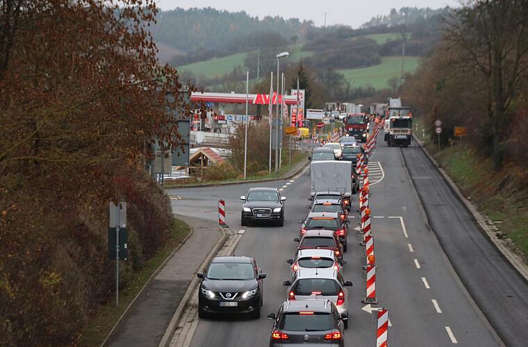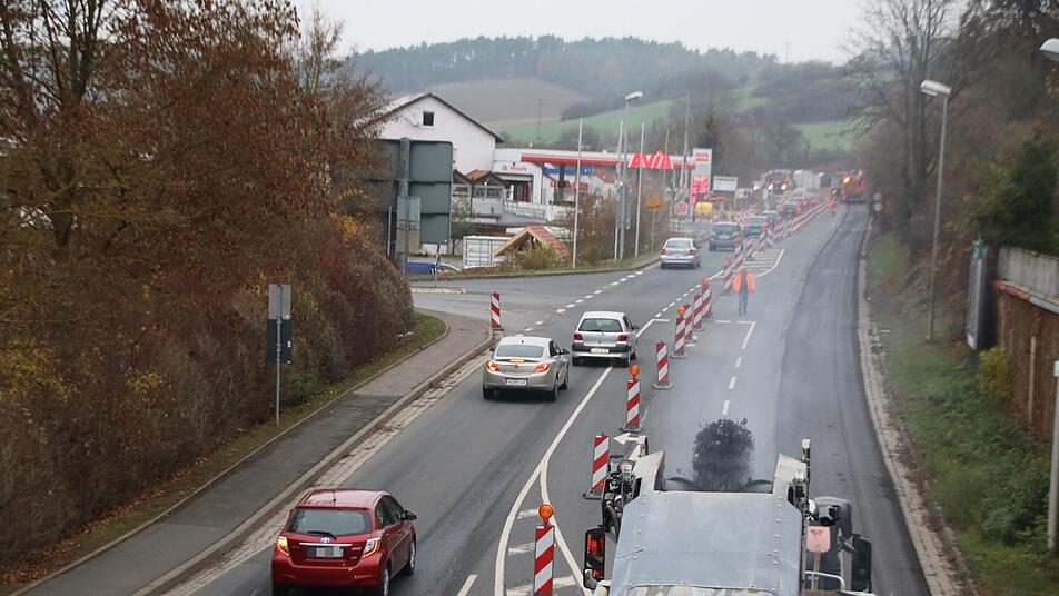 Die Asphaltschicht der Bundesstraße wird in diesem Bereich erneuert, außerdem wird eine Linksabbiegerspur zur Tankstelle errichtet. Laut dem Staatlichen Bauamt Schweinfurt dauern die Arbeiten bis Mitte Dezember. Kosten: 175 000 Euro.
